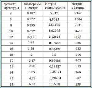 В таблицах, разработанных с учётом ГОСТа для арматуры, приведены следующие данные количества метров, содержащихся в тонне металлопроката: