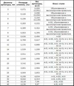 Наименьший диаметр прутков класса А3 равняется 6мм, а наибольший 40мм. Ниже представлена таблица веса арматуры А3.