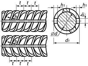 Арматурная сталь периодического профиля представляет собой круглые профили с двумя продольными непрерывными выступами (рёбрами) и поперечными выступами, равномерно расположенными на поверхности под углом к оси стержня и к рёбрам.