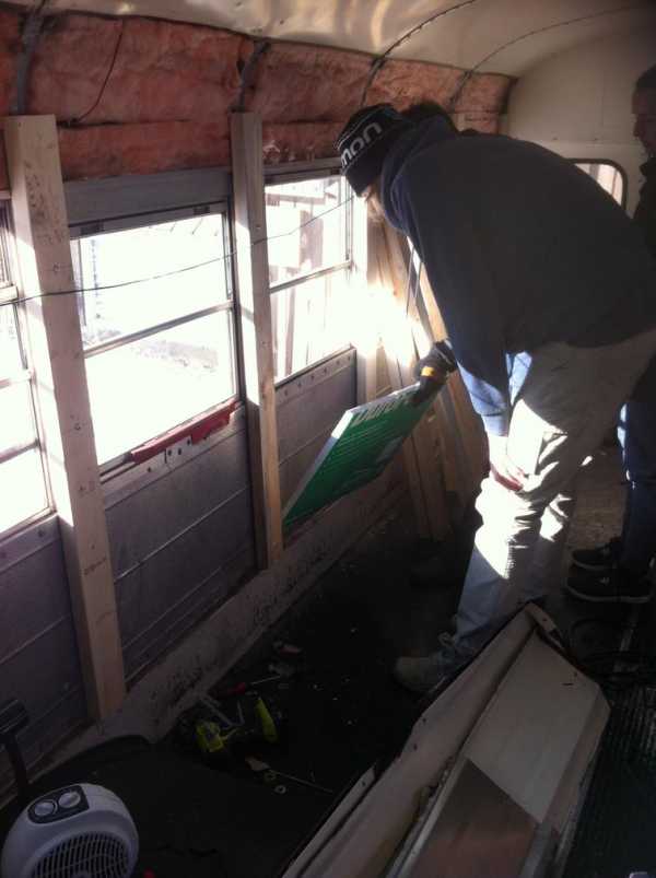 Парень по имени Крис срезал внутреннюю обшивку выше и ниже окна, чтобы они могли установить крышу и изоляцию