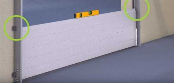 - Первая секция устанавливается на пол (он, кстати, должен быть ровным, допустимое отклонение — 5 мм на весь проем, без резких перепадов). Установив, проверяем горизонтальность ее верхнего края. Следим также за тем, чтобы края находились на равном расстоянии от края направляющих, чтобы не мешал крепеж.