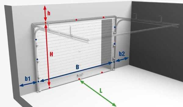 - Расстояния от края проема до боковых стен (справа (b2) и слева(b1). Называется еще «заплечики». По бокам от проема монтируются направляющие и расстояние от проема до боковых стен влияет на выбор их конструкции и способа установки.