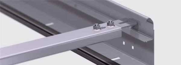 Потолочные направляющие крепятся к перекрытию при помощи специальных телескопических подвесов. С ними удобно выставлять плоскость — высота подвеса регулируется винтом, который скользит в длинной прорези. Есть несколько типов подвесов под разную высоту притолоки. При стандартном/низком монтаже и притолоке до 300 мм используют повесы CS1. Есть еще CS2 — длиной 500 мм, CS3 — 800 мм, CS4 — 1000 мм, CS5 — 1500 мм. Их крепят к потолку, выставляют требуемую высоту. Если торчит слишком большой кусок подвеса, его отрезают, оставив пару сантиметров ниже установленного фиксирующего болта.