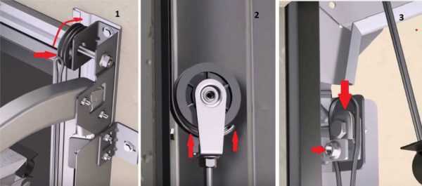 - Готовим к установке нижний ролик. Он имеет особую форму — со штырем в нижней части. На штырь надеваем петли на конце двух тросиков, устанавливаем шайбу, закрепляем при помощи шпильки (отогнув торчащие концы в разные стороны).