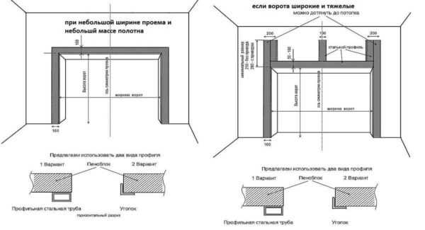 Притолока и потолок должны быть выполнены из прочных материалов, потому что главный вес секционных гаражных ворот ляжет на них. Заплечники такой большой нагрузке не подвергнуться, но все равно должны быть достаточно прочными, так как к ним крепятся направляющие.