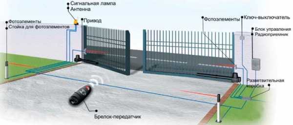 Данная система состоит из двух линейных электроприводов и блока управления, а также антенны, сигнальной лампы и электромагнитного замка. Стоит отметить, что автоматические распашные ворота подключают к обычной бытовой электрической сети переменного тока с напряжением в 220 Вт.