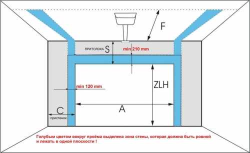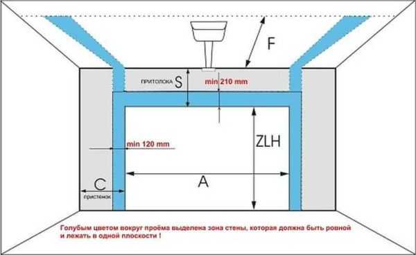 Кроме несущей способности и параметрам проема, необходимо проверить, чтобы его поверхность была ровной и гладкой. Также должны быть выровнены стены вокруг проема и две полосы на потолке. К ним будет крепиться система направляющих, все они должны быть ровными, и лежать в одной плоскости.