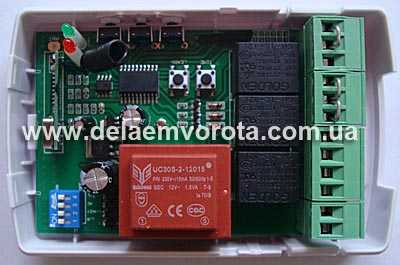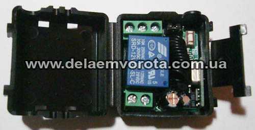 Также иногда встречается пятиконтактная версия приемника — «-«, «+», «no», «com» и «nc». Контакты «-» и «+» подключаем к контактам «АС24V» на блоке управления двигателем. Контакт «сом» подключаем к контакту «gnd», а контакт «nc» к контакту «photo» на блоке управления. Контакт «no» подключать не нужно.