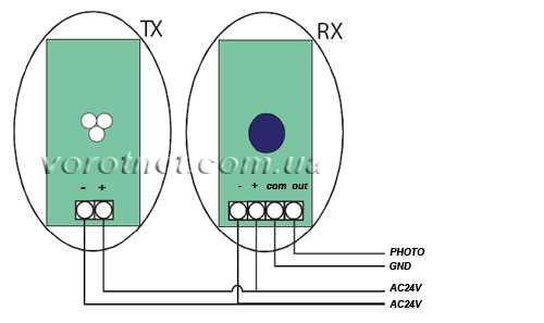 Фотоэлемент- приемник имеет четыре контакта — «-«, «+», «сом» и «out». Контакты «-» и «+» подключаем аналогично первому датчику к контактам «АС24V» на блоке управления двигателем. Контакт «сом» подключаем к контакту «gnd», а контакт «out» к контакту «photo» на блоке управления.
