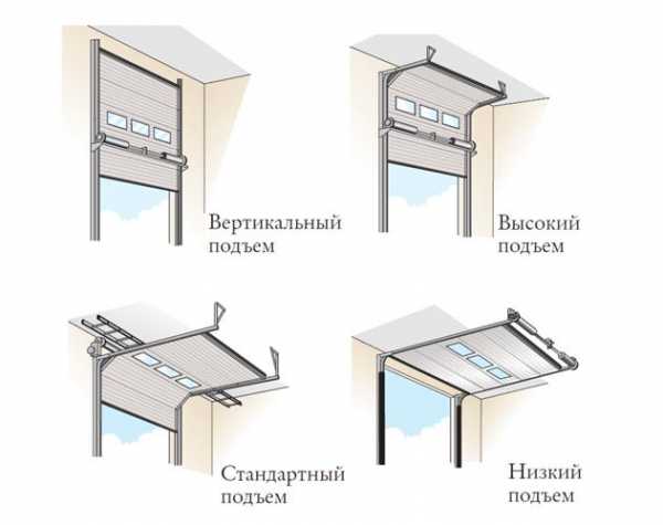 Секционные ворота подразделяются на типы, в зависимости от параметров, особенностей гаражных помещений и условий монтажа.