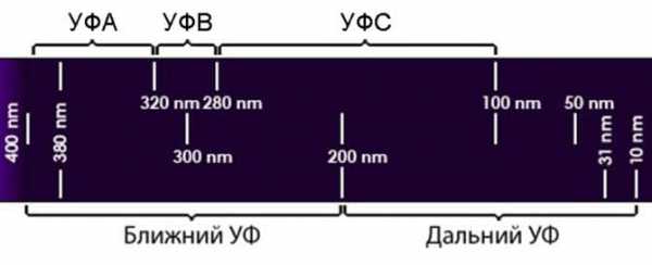Разделение ультрафиолетового диапазона на поддиапазоныНа рисунке хорошо видно, что весь УФ диапазон условно делится на два поддиапазона: ближний и дальний. Но на этом же рисунке сверху мы видим деление на УФА, УФВ и УФС. В дальнейшем мы будем пользоваться именно таким разделением – ультрафиолет А, В и С, поскольку оно четко разграничивает степень воздействия излучения на биологические объекты.