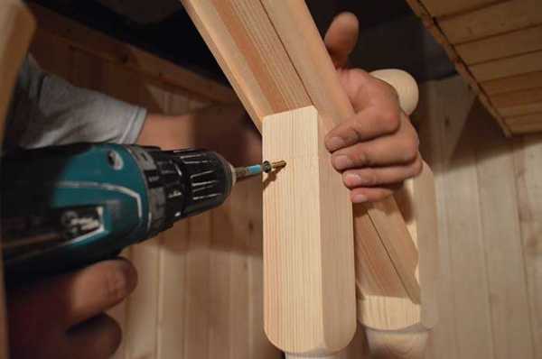 Самый простой и быстрый способ крепления. Саморезы обеспечивают прочность соединения элементов, но имеют один большой недостаток — после монтажа конструкции видны их шляпки. Это портит эстетический вид лестницы. Подобный вид крепления широко используется для соединения плоских балясин при устройстве беседок, ограждений крылечек.