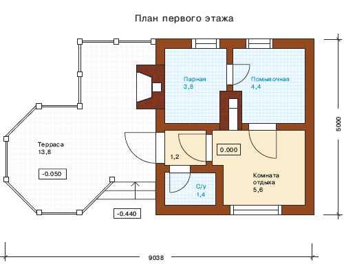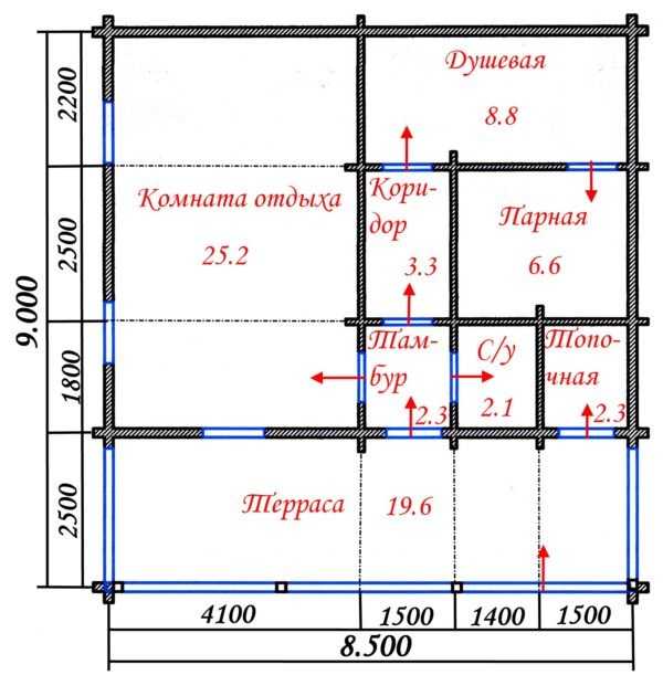 Размеры комнаты отдыха — три с половиной на три с половиной метра, душевой — один и шесть на два с половиной метра, парной — один и девять на два с половиной метра.