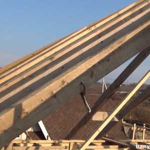 - Далее на опору бани крепят стропила. Для этого используются такие материалы, как брусья или доски. Расстояние между ними не должно превышать одного метра. В верхней части стропил, где будет крепиться конёк, брусья необходимо спилить под определённым углом и соединяются впритык.