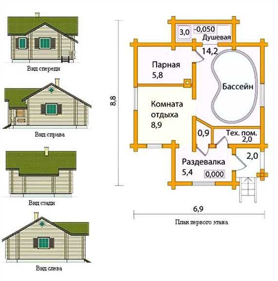Владельцам маленького участка не стоит отказываться от бани с бассейном. Мечту можно осуществить даже на площади 8,8х6,9 м. Установить придется маленький бассейн в бане, но он будет. Площадь под комнату с купелью отводят 14,2 м2. Остальное пространство отводят для раздевалки, парилки, душевой, технического помещения и комнаты отдыха.