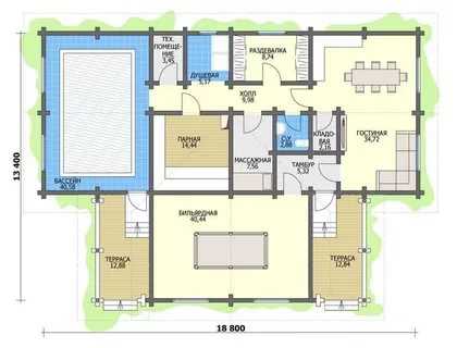 Если в бане из бруса планируется частый отдых компании, состоящей из 4 человек и более, разрабатывают проект большого комплекса размером 18,8х13,4 м. Объемная купель поместится на террасе, где крыша будет закрывать воду от загрязнения листвой, птицами и другим мусором. Площади хватит, чтобы бассейн разместить внутри здания. Террасу можно разделить на 2 части, обустроив между ними бильярдную.