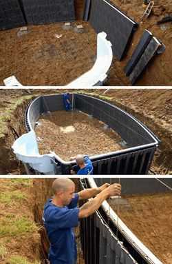 После того как котлован под ёмкость вырыт, стены стационарного бассейна бетонируют или обкладывают кирпичами. В бетонный раствор добавляются разнообразные добавки, которые сделают кладку более прочной и влагостойкой. После этого кирпичные стены бассейна штукатурят и на них кладут керамическую плитку.