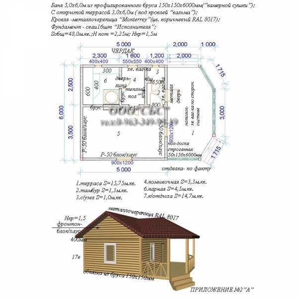 Планировка бани 5х6 из бруса с открытой террасой 1,5х2,5м под общей кровлей