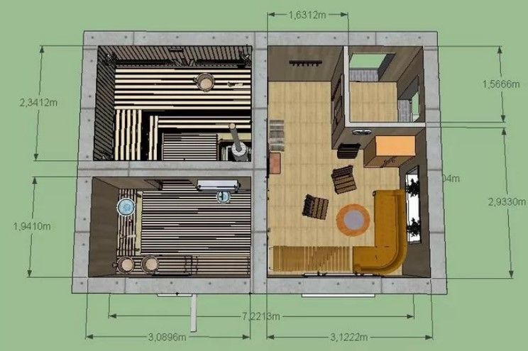 Распределение площадей при этом может быть самым разным: большая парилка и маленькая мойка, наоборот, просторная комната отдыха небольшие функциональные помещения. Выбираете то, что вам больше нравится и кажется более правильным: у всех разное представление о том, как все должно быть организовано. Причем не бойтесь передвигать перегородки так, как вам удобнее, под них потом поставите фундамент и все будет отлично.