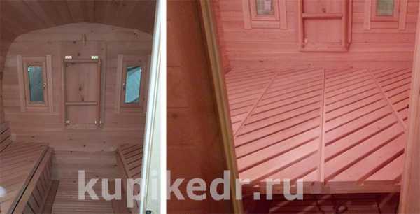 Во всех отделениях на полу лежат трапики из кедра. Если вы заказываете баню в сборном (готовом) виде, то уже установлена электропроводка под ключ, в каждом отделении есть светильники.