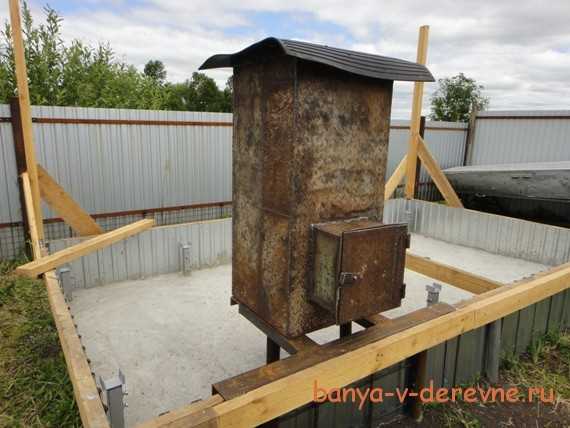 Она самодельная, трёхходовая, сварена из черного металла, толщиной 6мм. Сверху печи будет установлен бак из нержавеющей стали для горячей воды.