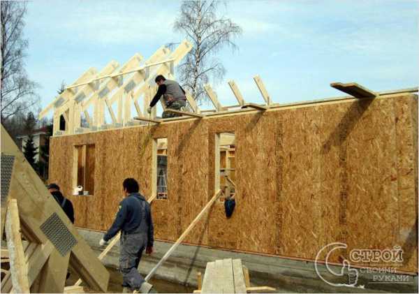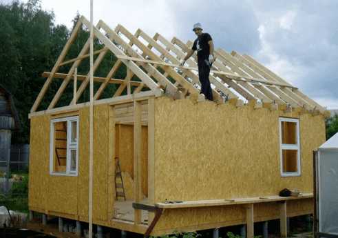 После установки стоек и лаг под полы начинаем обшивать дом листами osb-3