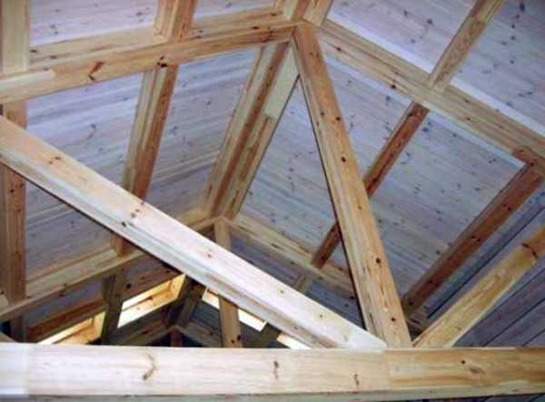 - Потолок делается подвесным из брусьев с обрешеткой и обивкой из деревянной вагонки. Стропильная система, в отличие от стен, изготавливается не из профилированного, а из обычного обрезного бруса.