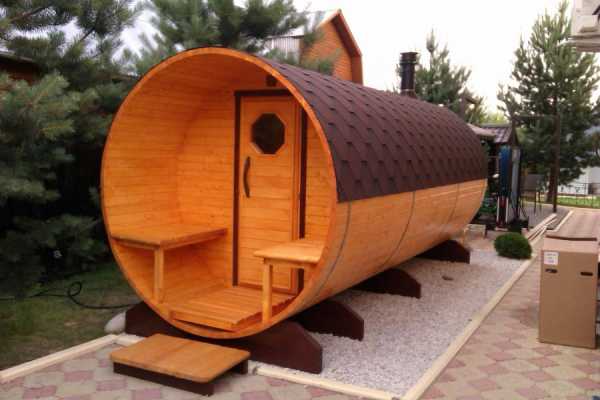 На фото — оригинальная конфигурация бани в виде бочки