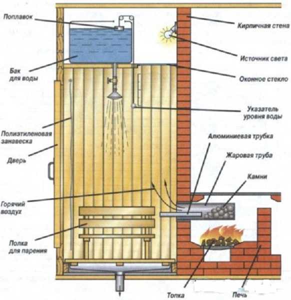 Понятно, что построить одноместный банный бокс можно лишь в том случае, если в помещении дачи, в непосредственной близости к стене, сложена кирпичная печь.
