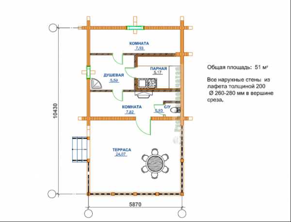 Баня с террасой (площадь 51 м. кв.)Планов готовых объектов много, и это объяснимо тем, что бани популярны уже не один век. Еще во времена древней Индии люди создавали некое подобие парилок, выкапывая глубокие ямы и закидывая из раскаленными камнями. Поверх такого сооружения накидывали шалаш, в котором часами могли париться люди.