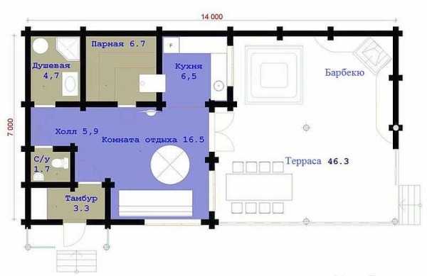 Кроме того, весьма популярны проекты бань с комнатой отдыха и кухней. Это уже целый архитектурный комплекс, который строится по своим законам. Так, например, если вы изберёте этот проект, вам придётся позаботиться об обустройстве хорошей вентиляции и гидроизоляции. Данные системы позволят своевременно удалять из помещения лишнюю влагу и неприятные запахи, что положительно скажется на уровне комфорта в гостевой комнате.