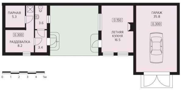 Преимуществом представленного ниже проекта гаража с баней является и то, что здесь баня и гараж находятся в отдалении друг от друга, они разделены летней кухней и террасой, благодаря чему нет необходимости делать усиленную гидроизоляцию, чтобы защитить гараж от высокой влажности, свойственной парной и моечной.