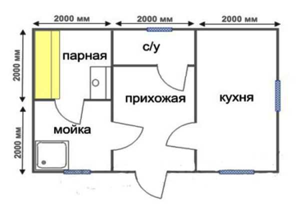 Чтобы в помещении было тепло, важно с особым вниманием отнестись к расположению входа в кухню и в парную. Желательно делать его с теплой и солнечной южной стороны.