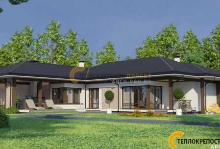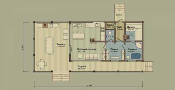 Просторная постройка 15,2х6,9 м без труда заменит полноценный дачный дом. Здесь есть все, что нужно для комфортной жизни: просторная кухня, столовая-гостиная, санузел. Проект предусматривает и все для отдыха: парную, моечную, раздевалку, тамбур и террасу с летней кухней.