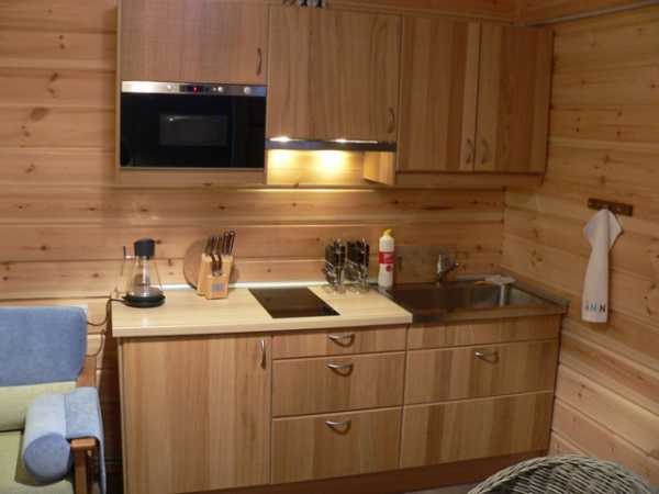 Кухня встроена в виде ниши в комнате отдыха, что достаточно удобно, т. к. она не занимает много места, при этом в ней легко поместится все необходимое для приготовления пищи.