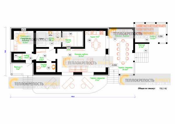 Удобным является наличие двух отдельных входов: один со стороны бани, а другой – через террасу в столовую-гостиную.