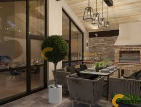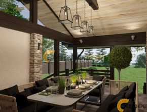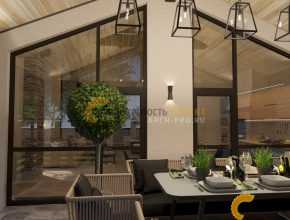 Этот проект, конечно, реализовать дорого, но он того стоит. Летом вы можете устраивать пикник на летней кухне, причем даже в дождливую погоду, т. к. терраса имеет крышу. Зимой же можно спрятаться в домике, где также есть своя кухня.