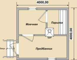 Составление проекта любой бани, и строение размерами 4х4 м не является исключением, начинается с обозначения расположения наиболее главных помещений рассматриваемого строения, т.е. парилки, помывочной комнаты и предбанника.