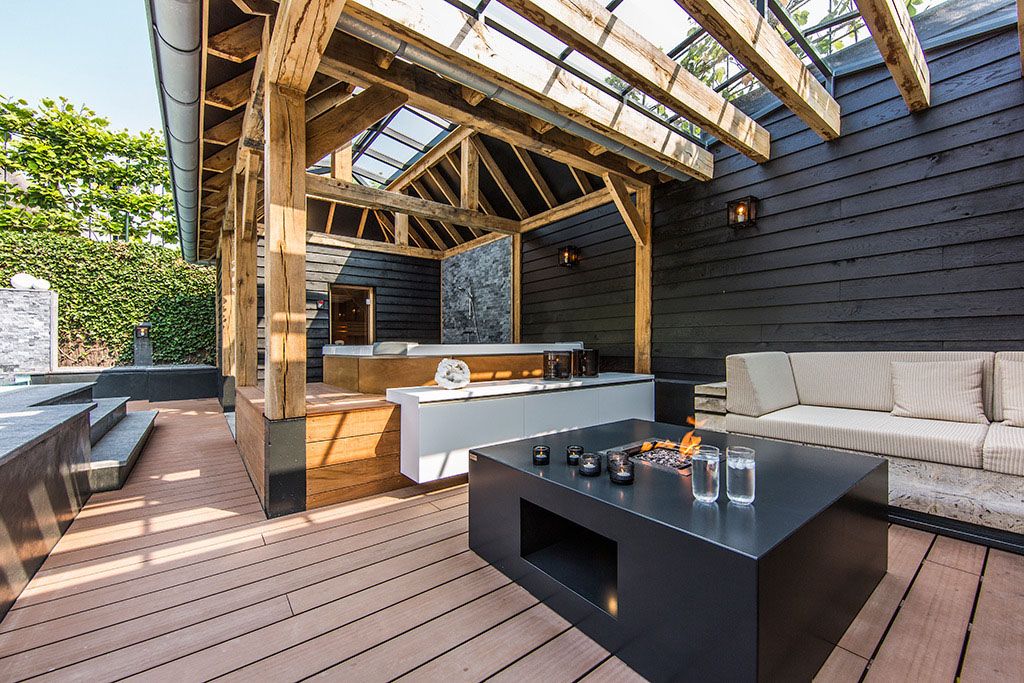 Декор же полностью зависит от вашего вкуса. Мы советуем использовать в дизайне бани с террасой и барбекю такие прочные природные материалы как камень, сталь, плитка и т. д.