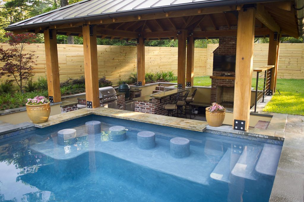Угловая баня сможет стать отличным вариантом совмещения самой бани, зоны барбекю и расположенного между ними открытого бассейна под единой крышей. Такой внутренний дворик с бассейном позволит облегчить его обслуживание и создаст эффект открытого пространства.