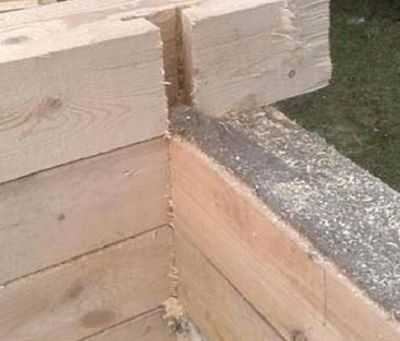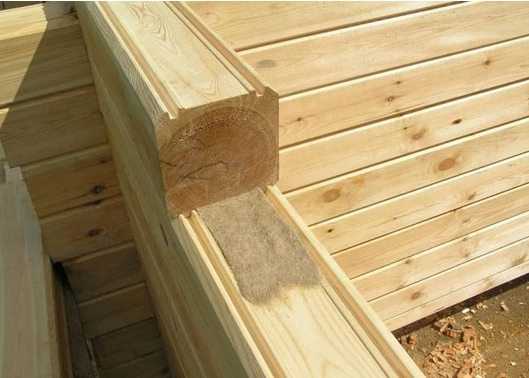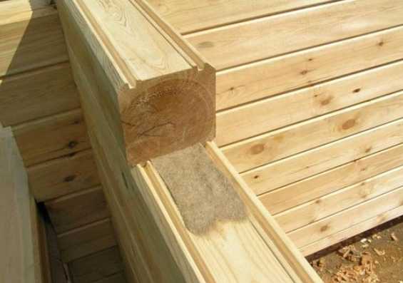 Между звеньями раскатывается утеплитель. Он может быть из джута или льна, но обязательно ленточный. Размещается в специальную ложбинку замкового соединения. Особое внимание нужно обратить на угловые соединения.