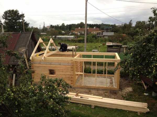 - Следующий этап в строительстве щитовой бани своими руками – укладка потолочных балок, на которые опираются стропильные элементы фермы двускатной крыши. Конструкция остова крыши зависит от выбираемого кровельного материала и его веса. Желательно укладывать легкий материал, поскольку основание и несущие конструкции строения не рассчитаны на большой вес. Поэтому кровлю обычно делают из железных или рулонных материалов.