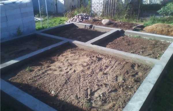 Внутри периметра ленточного основания насыпьте полосы из песка и щебенки. В дальнейшем вы сможете залить их бетоном либо же соорудить деревянный пол – конкретный вариант выбирайте на свое усмотрение.
