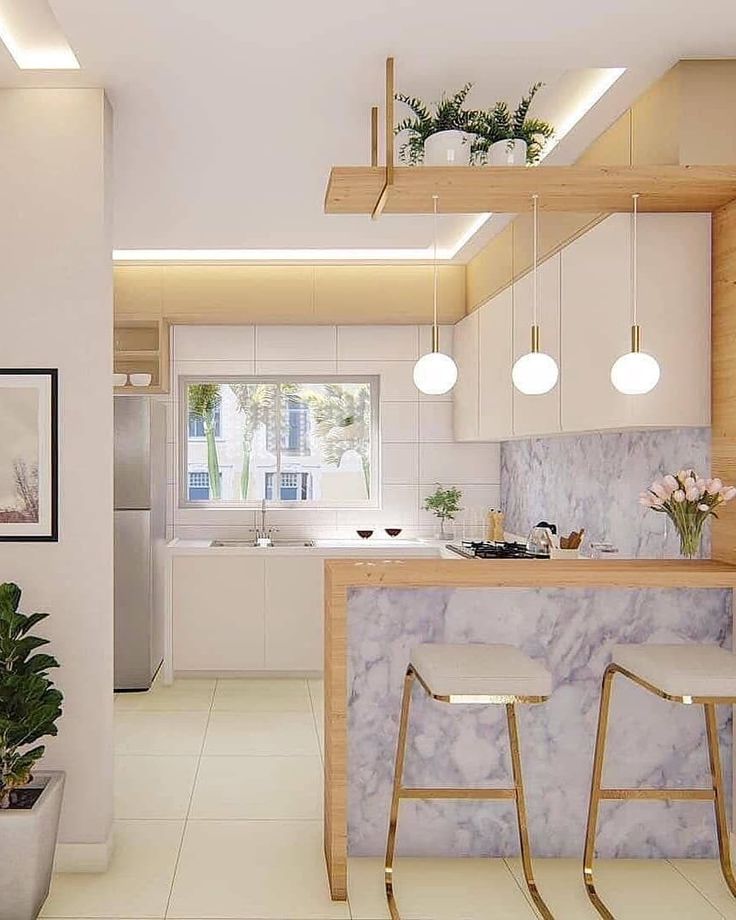 Этот гламурный кухонный бар (1) является современным шедевром, и нам нравится, как он идеально вписывается в пространство, не будучи властным. Состоящая из мраморного островка-водопада и расположенная прямо между кухней и гостиной, эта кухонная барная зона может быть небольшой, но от нее захватывает дух. Мраморный кухонный бар в сочетании с золотыми и темно-синими барными стульями добавляет элегантности этому интерьеру.