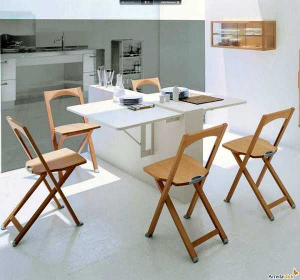 Складная барная стойка. Если в жилом помещении с маленькой кухней проживает многочисленная семья, то именно складная (раскладная) барная стойка станет оптимальным вариантом. В собранном состоянии такая конструкция выглядит, как небольшая тумбочка, помещающаяся в любом свободном углу (у стены), и ее поверхность вполне достаточна для перекуса в течение дня или чашки утреннего кофе. Для обеда в полном составе семьи достаточно лишь быстро поднять и поставить на ножки, опущенную вниз столешницу.