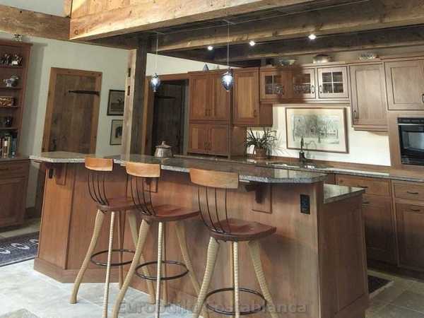 Просторная площадь кухни может позволить разместить не только большой мебельный гарнитур, но и дополнительные элементы, например, барную стойку в виде остова. Обычно такой вариант является продолжением кухни и изготавливается из того же материала, что и модули гарнитура. Но при желании может иметь индивидуальную конструкцию и внешний вид.