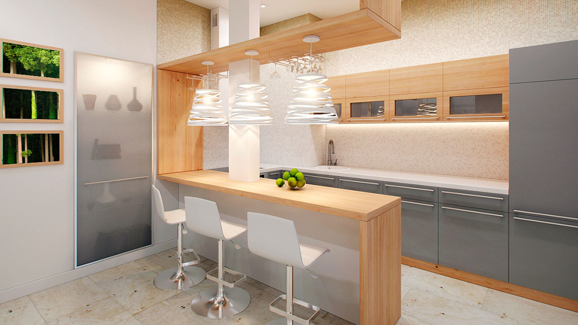 Если площадь кухни небольшая, то барная стойка, скорее всего, является многофункциональной. Она может служить элементом, которая разделяют зону на кухню и на столовую. Если кухня совсем маленькая, то барная стойка будет выполнять функцию обеденного стола. В таком случае ее лучше расположить у стены.