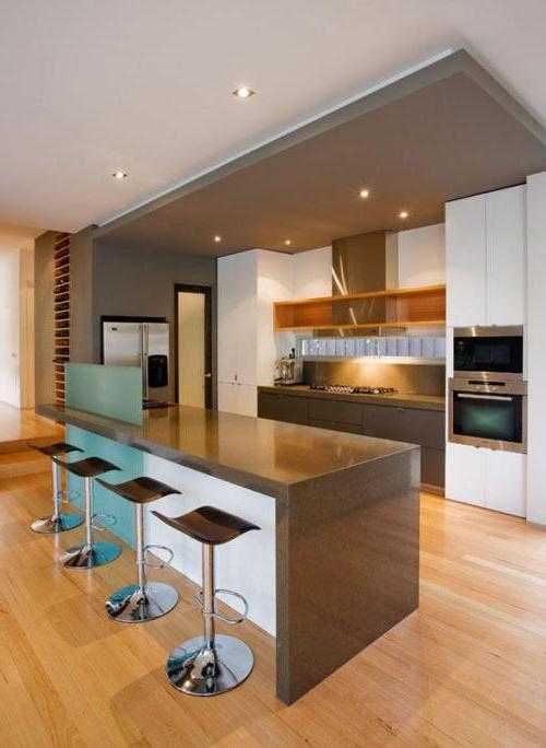 Саму барную стойку подобного типа можно разделить на две зоны: рабочую область, где хозяюшка воплощает в жизнь свои кулинарные задумки, и обеденную, где, собственно, и восседают голодные домочадцы в ожидании их завтрака. Вторую часть, как правило, слегка приподнимают, добиваясь тем самым эффекта «барной стойки».