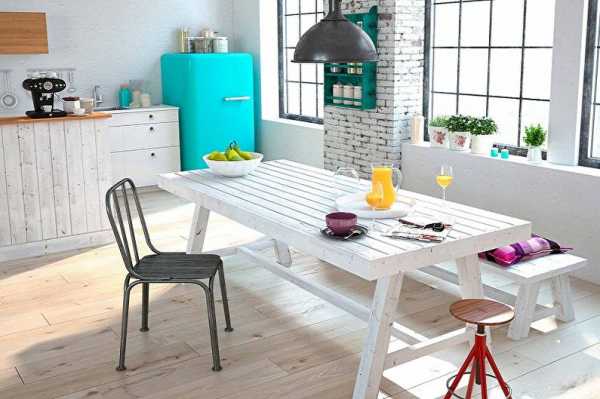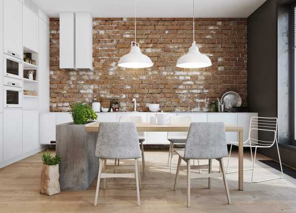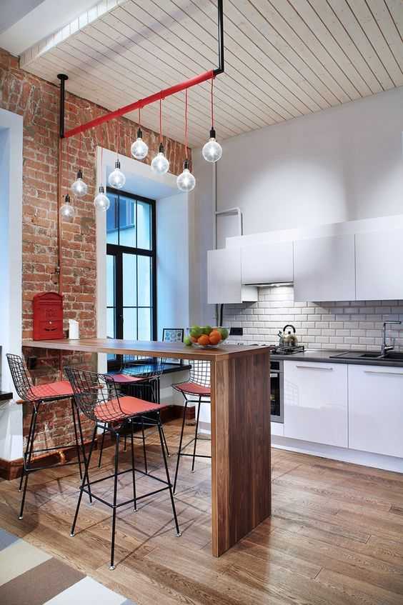 Стол зачастую делают из паллет, либо выбирают эффектные варианты из камня, дерева или пластика. Если Ваша кухня не отличается обилием свободного пространства, стол можно заменить барной стойкой, которая так же сослужит роль рабочей зоны для приготовления пищи, и будет замечательным вариантом грамотного разделения пространства в квартире. На кухне белого цвета эффектно будет смотреться барная стойка из контрастного красного кирпича.