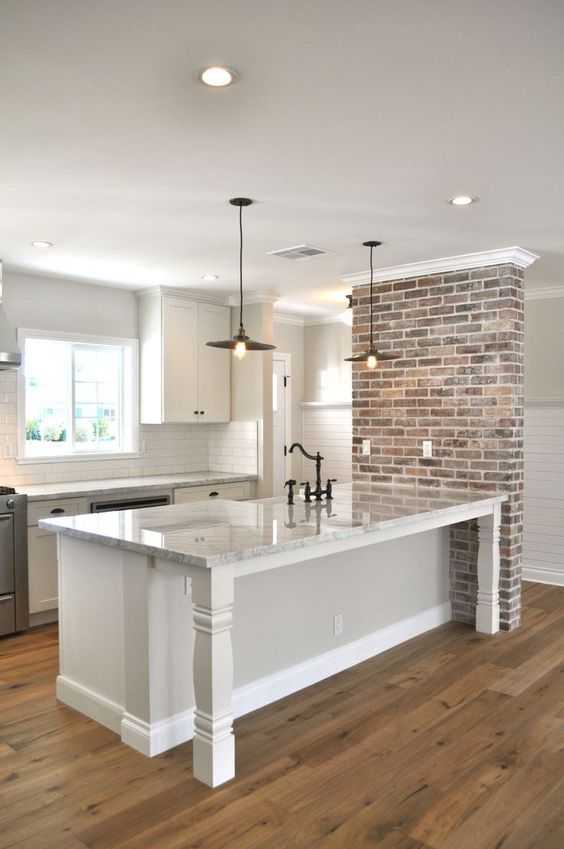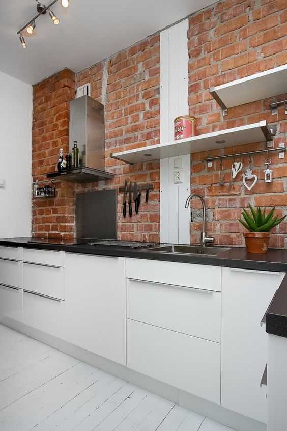 Кирпичная белая стена — одна из самых узнаваемых вещей в лофте. Им стоит отделать по меньшей мере одну стену. На кухне хорошим вариантом станет фартук из кирпича (или отделанный под него). В таком случае «кирпичной» стеной лучше сделать не противоположную стене с фартуком, а примыкающую. При этом хорошо использовать белый кирпич, но классический красный будет смотреться не хуже.